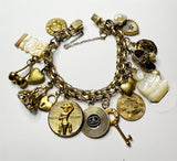 Vintage Charm Bracelet. Stamped AR 1/20/12k GF. Brass with a gold wash with 16 charms, including 2 trojan coins, cherries, brass heart locket, watch fob, heart padlock, virgin islands, capitol records stamped sterling, skeleton key, pisces stamped sterling, 2 hearts, mother pf pearl Buddha, baby shoe, 2 hearts, mother of pearl tiki totem. Measures 7 " Excellent condition.